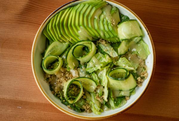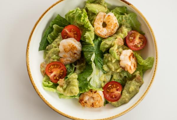 Салат микс, с авокадо, огурцом с соусом нисуаз