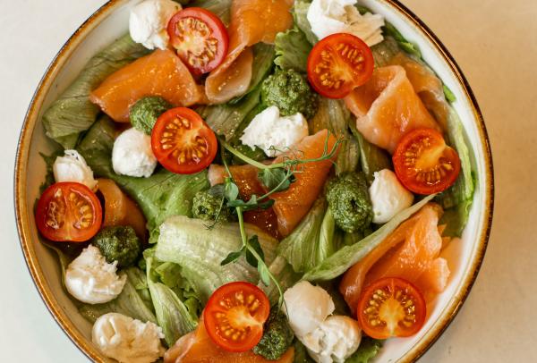 Салат микс, лосось слабой соли, песто, моцарелла, помидорки черри, сдобрен зеленым маслом